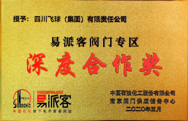 在交流會上,中國石化南京閥門中心領(lǐng)導(dǎo)對2019年度易派客閥門專區(qū)建設(shè)深度合作單位、閥門優(yōu)秀供應(yīng)商單位進行了表彰,并頒發(fā)了榮譽獎牌,四川飛球(集團)有限責(zé)任公司榮獲了“中國石化2019年優(yōu)秀供應(yīng)商”、“易派客閥門專區(qū)深度合作獎”。