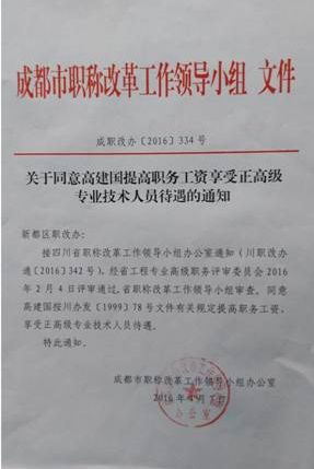 本網(wǎng)訊(王珊珊報道)2016年2月 4日,高建國總經(jīng)理順利通過了四川省工程專業(yè)高級職務(wù)評審委員會評審。并經(jīng)省職稱改革工作領(lǐng)導(dǎo)小組審查,同意其享受正高級專業(yè)技術(shù)人員待遇。