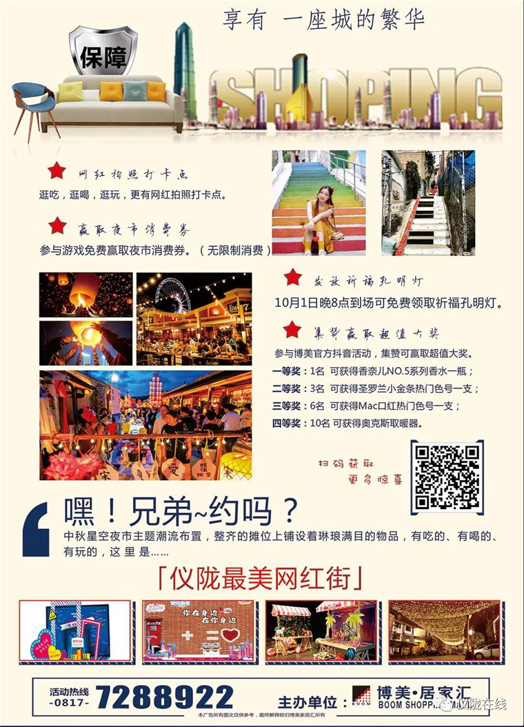 ?本網訊(謝碧靜報道)近日,儀隴又多了一個網紅打卡點,更潮更具特色的創(chuàng)意網紅街——博美星光夜市9月19日-10月8日火熱開市啦!博美星光夜市將打造成儀隴最美網紅街,帶你體驗儀隴博美真正的夜市藝術。
