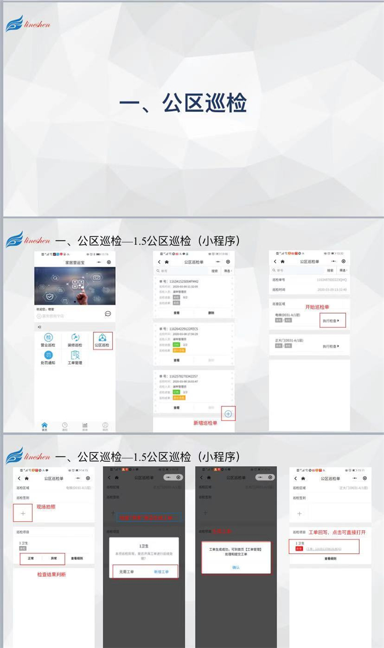 1、營(yíng)運(yùn)巡檢:樓管對(duì)正常營(yíng)業(yè)的商鋪進(jìn)行巡檢;2、裝修巡檢:樓管或工程對(duì)在裝修期的商鋪進(jìn)行巡檢;3、公區(qū)巡檢:樓管或工程對(duì)公區(qū)進(jìn)行巡檢,巡檢異常可以開據(jù)工單;4、處罰通知:巡檢過程中發(fā)現(xiàn)異常,進(jìn)行處罰;5、工單:5.1、商場(chǎng)人員手工開據(jù)的工單;5.2、公區(qū)巡檢生成工單;6、公告:查閱商場(chǎng)發(fā)布的公告信息。