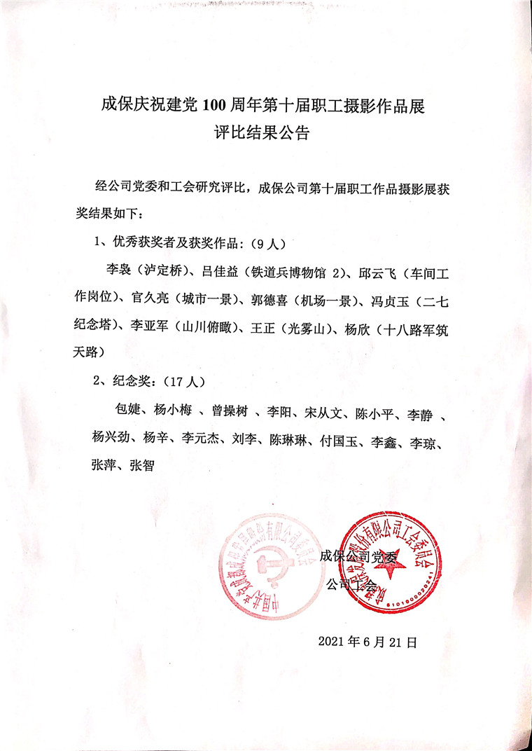 最終經(jīng)公司黨委和工會研究評比,共有李裊、馮貞玉、呂佳益、楊欣等9位參賽員工獲得優(yōu)秀獎,包婕等17位參賽員工獲得紀念獎。