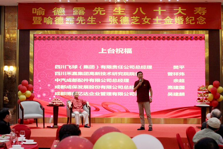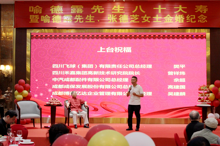 隨后,禾嘉控股公司總經(jīng)理上臺(tái)為喻德露先生送上了生日祝福。四川飛球(集團(tuán))有限責(zé)任公司總經(jīng)理樊平講到:”聽到夏主席提出為喻德露先生舉辦八十壽辰時(shí),我十分感動(dòng),感動(dòng)于禾嘉的家文化,是許多企業(yè)不可比擬的。我1996年進(jìn)入禾嘉,那時(shí)候經(jīng)常聽到喻伯伯的笛子聲,至今已經(jīng)27年,仍然記憶猶新,有機(jī)會(huì)很想再聽一次。”四川禾嘉集團(tuán)高新技術(shù)研究院院長曾祥煒講到:”我作為禾嘉的”新兵”,到集團(tuán)的時(shí)間不長,已經(jīng)第二次感受到禾嘉家文化的感人了,我深深體會(huì)到這是一個(gè)有責(zé)任感的,有使命感的,懂得感恩的公司。喻先生當(dāng)年義無反顧地與夏主席一起創(chuàng)業(yè),而禾嘉人不忘本,特別是夏主席如此珍視創(chuàng)業(yè)伙伴,今天這個(gè)壽宴,令我們這些老同志,感觸更加深刻,與這樣的公司同行,很幸運(yùn)也很欣慰?!敝衅啥寂浼邢薰究偨?jīng)理余超講到:”喻伯伯毅然選擇跟夏主席一起創(chuàng)業(yè),并成為了一生的摯友,是人生的一大幸事。我深深的感受到了咱們集團(tuán)的家文化,不僅是作為中國傳統(tǒng)的文化,也是禾嘉成長的根。夏主席曾說到,家就是港灣,能為我們遮風(fēng)擋雨,同時(shí)我們也要為家做出貢獻(xiàn)。在自己的崗位上,為家作出更大的努力,為家創(chuàng)造價(jià)值?!背啥汲杀0l(fā)展股份有限公司總經(jīng)理高建國講到:”喻伯伯是我入黨的引路人,猶記得以前開會(huì),喻伯伯見到我就會(huì)問,入黨了嗎的話語。今天在喻伯伯的八十壽辰上,再一次感受了禾嘉家的氛圍,家的溫暖,也激勵(lì)著我們繼續(xù)努力,把禾嘉做到一個(gè)新的高度?!背啥疾┟纼|達(dá)企業(yè)管理有限公司總經(jīng)理吳建麟講到:”我是一名禾二代,喻伯伯可以說是看著我長大的禾嘉老前輩,因?yàn)橛辛饲拜厒兊钠D難創(chuàng)業(yè),才有了今天的禾嘉,今天的場面令我很感動(dòng),我將向前輩們學(xué)習(xí),將他們艱苦奮斗的精神發(fā)揚(yáng)光大。
