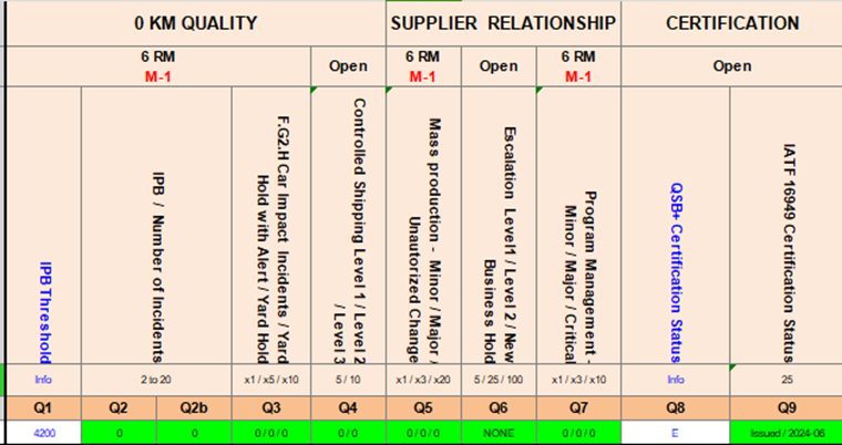 本次考評主要從IPB閾值、事故發(fā)生次數(shù)/事故總數(shù)、批量生產(chǎn)能力、項目管理能力、QSB+及IATF16949的認(rèn)證狀態(tài)等方面進(jìn)行考評。