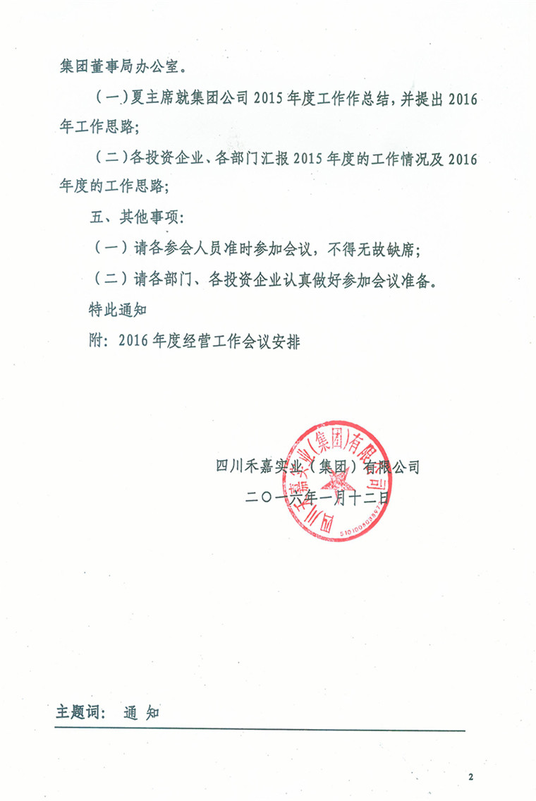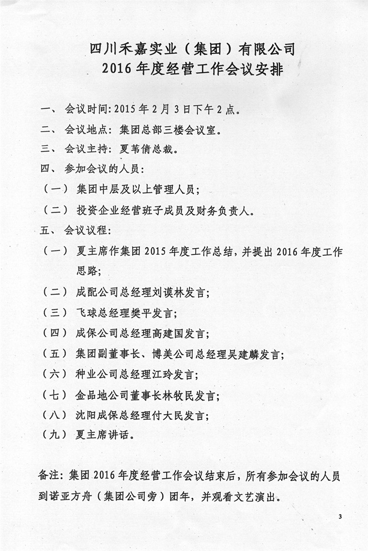 四川禾嘉集團(tuán)關(guān)于召開2016年度經(jīng)營(yíng)工作會(huì)議及會(huì)議安排的通知