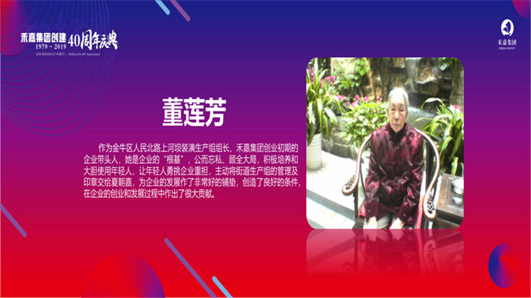 董蓮芳獲獎(jiǎng)理由:作為金牛區(qū)人民北路上河壩裝潢生產(chǎn)組組長、禾嘉集團(tuán)創(chuàng)業(yè)初期的企業(yè)帶頭人,她是企業(yè)的“根基”,公而忘私、顧全大局,積極培養(yǎng)和大膽使用年輕人,讓年輕人勇挑企業(yè)重?fù)?dān),主動(dòng)將街道生產(chǎn)組的管理及印章交給夏朝嘉,為企業(yè)的發(fā)展作了非常好的鋪墊,創(chuàng)造了良好的條件,在企業(yè)的創(chuàng)業(yè)和發(fā)展過程中作出了很大貢獻(xiàn)。