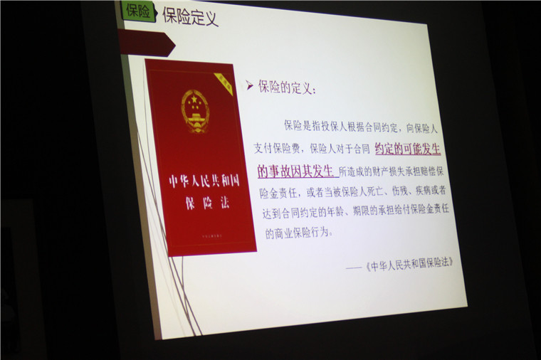 唐總介紹了保險的定義:保險是指投保人根據(jù)合同約定,向保險人支付保險費,保險人對于合同 約定的可能發(fā)生的事故因其發(fā)生 所造成的財產(chǎn)損失承擔賠償保險金責任,或者當被保險人死亡、傷殘、疾病或者達到合同約定的年齡、期限的承擔給付保險金責任的商業(yè)保險行為。